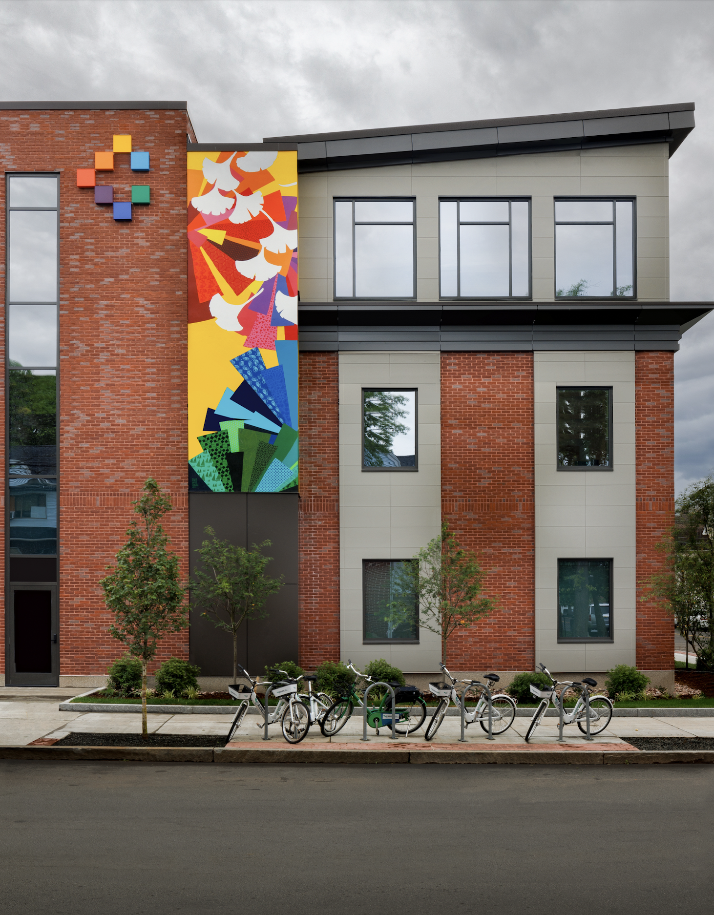 Silvia López Chavez is a Dominican-American artist based in Boston who painted the exterior murals to entice all who pass by the building. Silvia engaged the local community in developing a graphic interpretation of what it means to have a “right to healthcare” at FHCHC. The mural represents the welcoming embrace of the neighborhood and pays homage to local symbols and colors. Silhouettes of gingko leaves, the oldest surviving species of tree, are known for their healing properties and represent strength, resilience, hope, and peace.